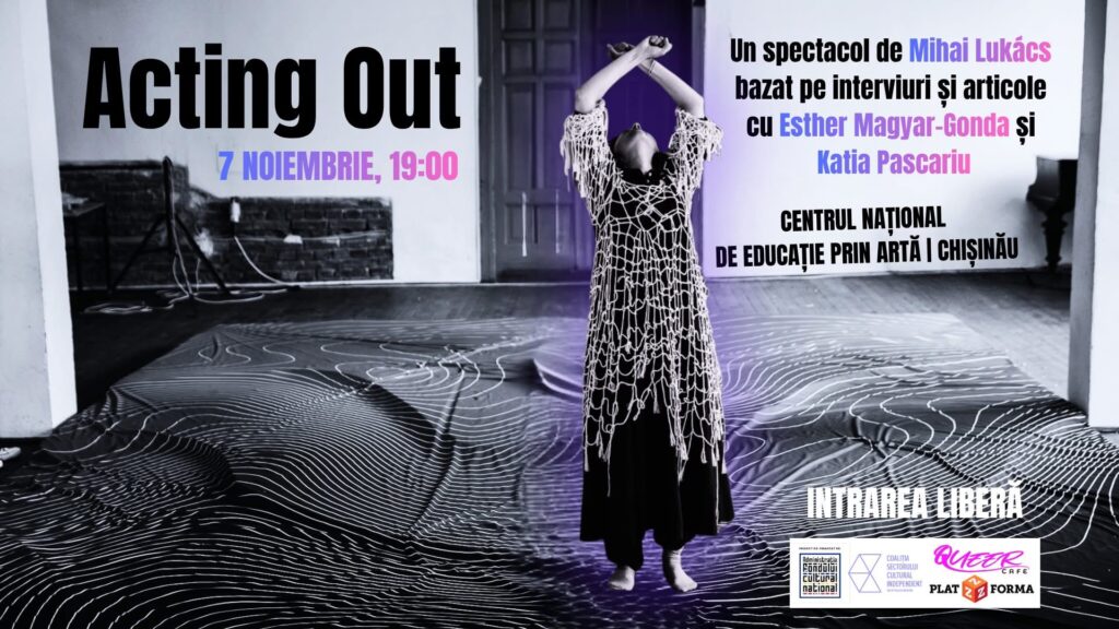 On November 7, 2025, at 19:00, at 23 Serghei Lazo St., Chisinau, will take place ACTING OUT, an interdisciplinary performance (theater, text, live music, video) signed by director Mihai Lukács and performed by actress Katia Pascariu. Admission is free, subject to availability.