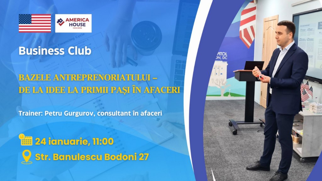 America House invită studenții, antreprenorii și tinerii interesați de afaceri și finanțe la o sesiune interactivă despre antreprenoriat. Sesiunea va avea loc pe 24 ianuarie, de la ora 11:00, la American House Chișinău, Participanții vor descoperi antreprenoriatul prin prisma modelului american și cum poate fi transformată o idee într-un proiect concret.
