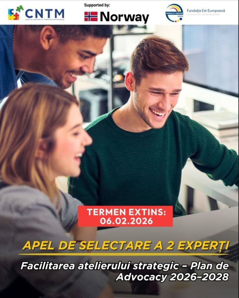 Centrul Național de Tineret din Moldova (CNTM) extinde apelul de selectare a doi experți. Experții vor facilita un atelier strategic de două zile. Scopul este elaborarea și validarea Planului de Advocacy al Platformei de Tineret pentru perioada 2026-2028, cu indicatori de monitorizare a implementării.