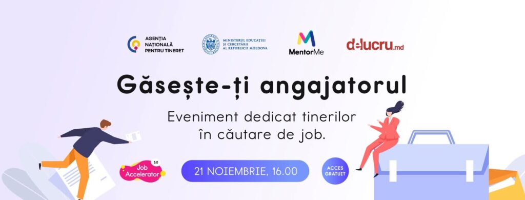 Pe 21 noiembrie, de la ora 16:00, la Chișinău (locația va fi anunțată celor înregistrați), are loc evenimentul „Găsește-ți angajatorul”, organizat de MentorMe în cadrul programului Job Accelerator 5.0, cu sprijinul Agenției Naționale pentru Tineret și al Ministerului Educației și Cercetării.