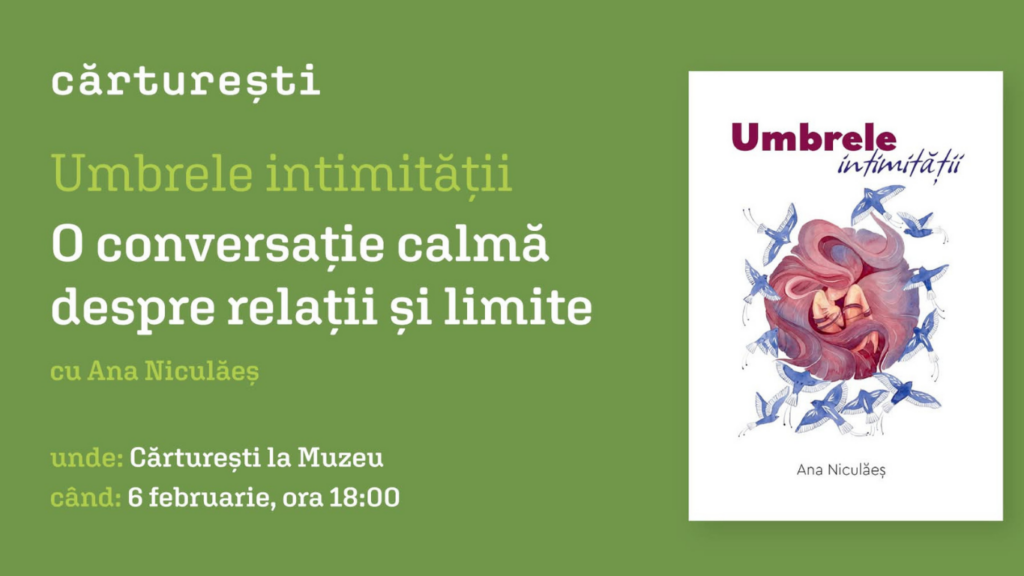 „Umbrele intimității – O conversaţie calmă despre relații și limite cu Ana Niculăeş” este un eveniment de dialog și reflecție pornit de la temele cărții Umbrele intimității, semnată de Ana Niculăeș, psihologă și psihoterapeută integrativă. Întâlnirea este dedicată celor care au citit cartea, vor să o citească sau pur și simplu vor să asculte și să înțeleagă mai bine propriile trăiri.