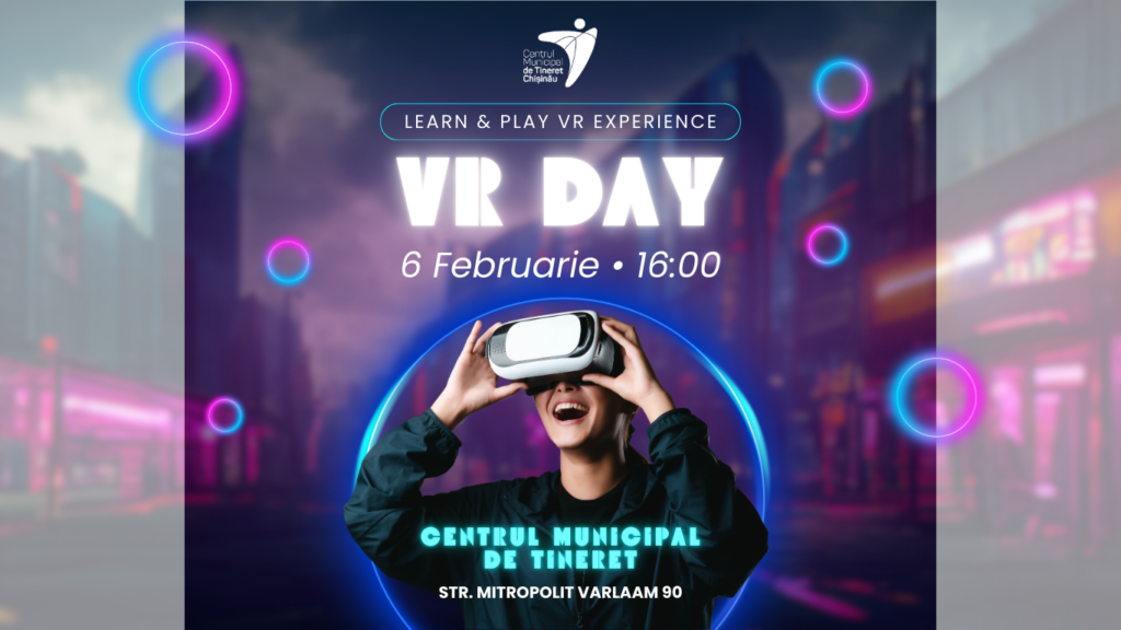 Centrul Municipal de Tineret Chișinău invită tinerii pasionați de tehnologie, inovație și experiențe interactive să participe la VR Day, un eveniment dedicat realității virtuale și noilor forme de divertisment digital.